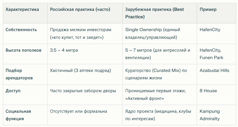 - Урок для РФ: Если вы хотите, чтобы в ЖК открылась классная пекарня или детский клуб, а не третий магазин разливного пива, нужно субсидировать аренду для «нужных» функций и закладывать избыточную высоту потолков на этапе проекта.