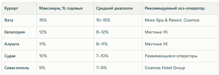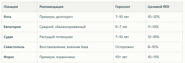 - Диверсификация: 40% Ялта (премиум), 40% Евпатория (средний), 20% Судак (рост потенциал)