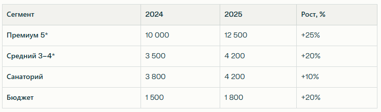 - Средняя стоимость номера: 6000–12000 руб./ночь (премиум), 3000–5000 руб./ночь (средний сегмент)