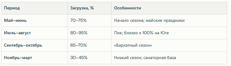 Загрузка: 60–75% летом, 30–45% в межсезонье