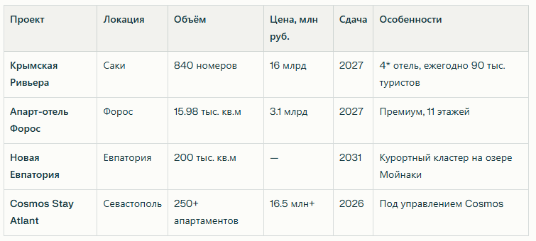 - Апарт-отель курорта «Мрия» (Форос) — строительство начнётся октябре 2025, ввод 2027; инвестиции 3,1 млрд руб.