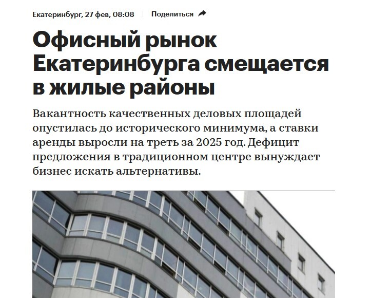 РБК: Офисный рынок Екатеринбурга смещается в жилые районы