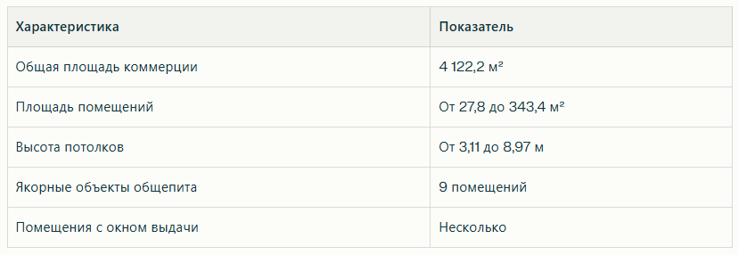 - Крупный кластер заведений общепита (1 397,4 м² из 4 122 м² — 34% площади!)