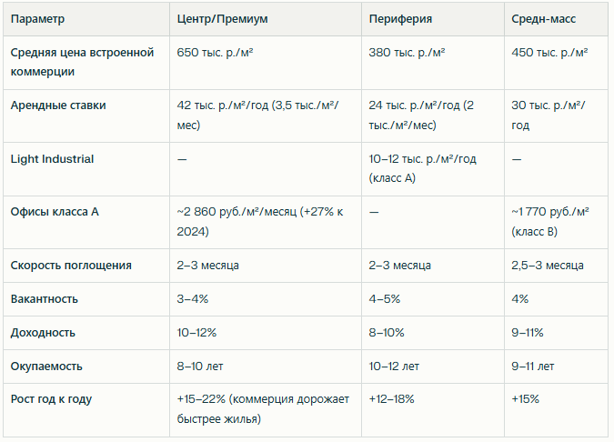 - Коммерция дорожает быстрее жилья (+15–22% коммерции vs +5–7% жилья)