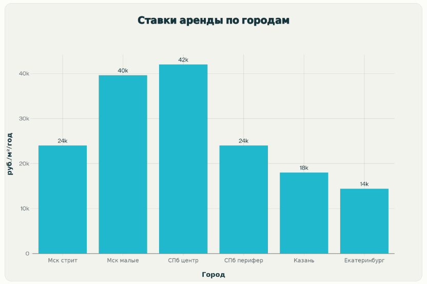 - Вакантность: 7,7% — исторический минимум, но растущий тренд указывает на перенасыщение определённых форматов (особенно магазины продуктов)