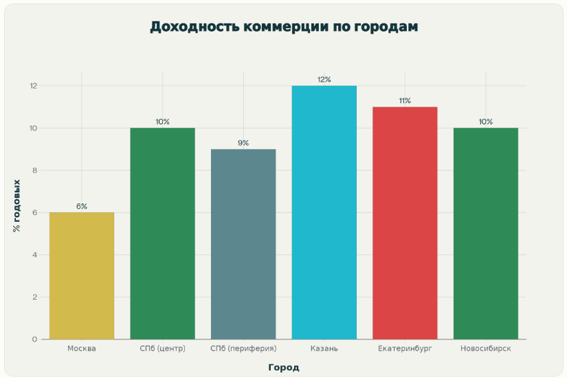 → Портфель: 40% СПб, 30% Казань, 20% Екатеринбург, 10% Новосибирск (риск-диверсифицированный подход).