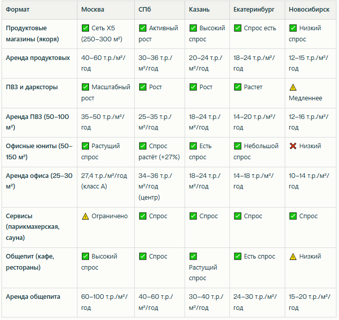 - Исключение: малые помещения (50–300 м²) продолжают дорожать (+3–5% месячно) — востребованы на встроенных локациях