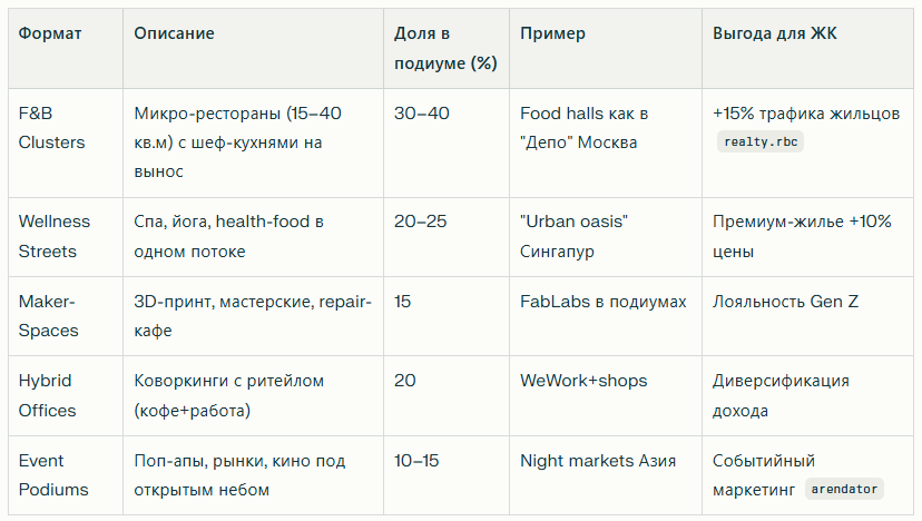- Этап 2025–2028: "Подиум 2.0" — многоэтажные коммерческие этажи (1–3) с rooftop-террасами под коворкинги/фитнес. Доля общепита вырастет до 35% (локальные бренды типа "Даблби"). В Москве/СПб — 20% новых ЖК с "активным цоколем". Появление отдельностоящих небольших коммерческих зданий вдоль бульваров.