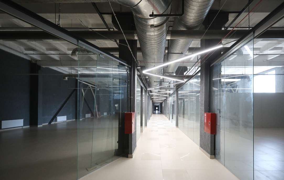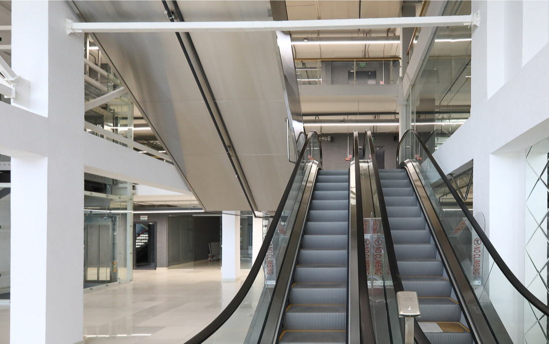Здесь два корпуса: в одном три высоких этажа, во втором — шесть. Их объединили и сделали небольшой атриум. Также здесь восемь эскалаторов, панорамный и грузовой лифты.