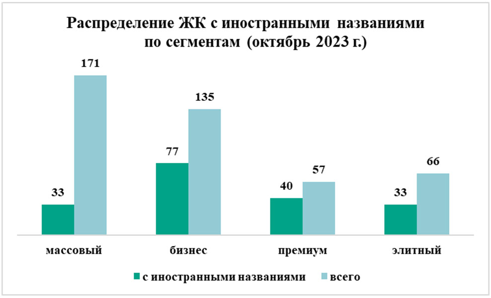 Коллеги из «Метриум» сделали любопытное исследование и посчитали доли мимикрирующих иностранных названий в разных классах ЖК. Множество объектов элитного и бизнес-классов не обошлись без «удорожающих цену» названий